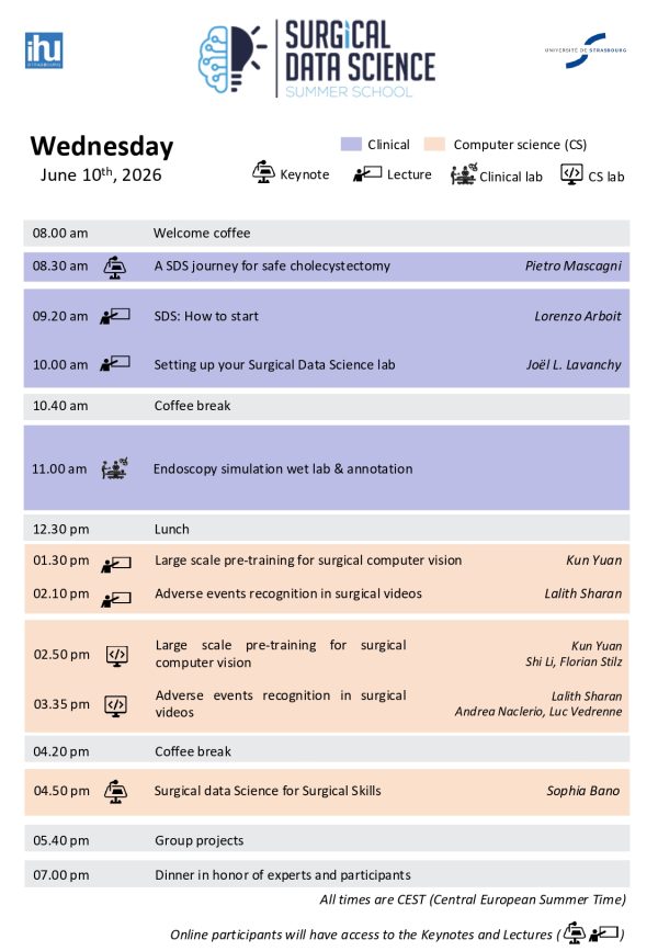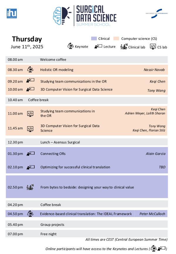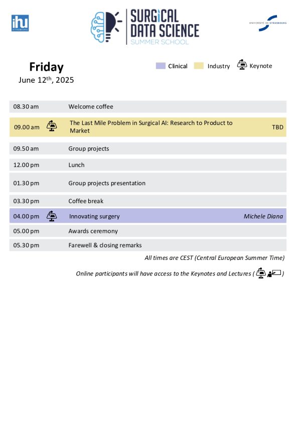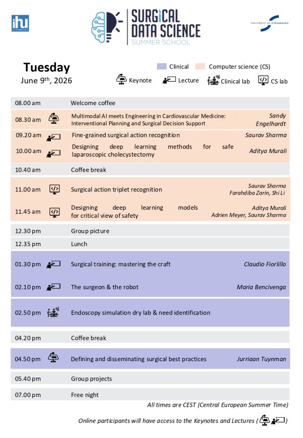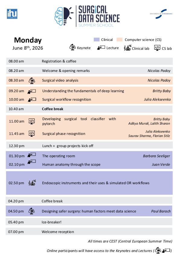 The summer school’s five-day on-site intense program will consist of a series of lectures and hands-on labs. These will also provide the participants with a unique opportunity to work in small teams on practical surgical data science projects under the guidance of mentors.